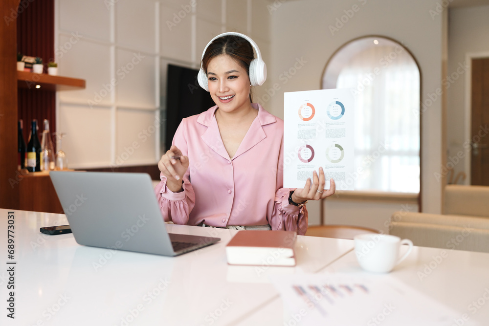 Businesswoman showing business chart while meeting on video conference and remote working at home.