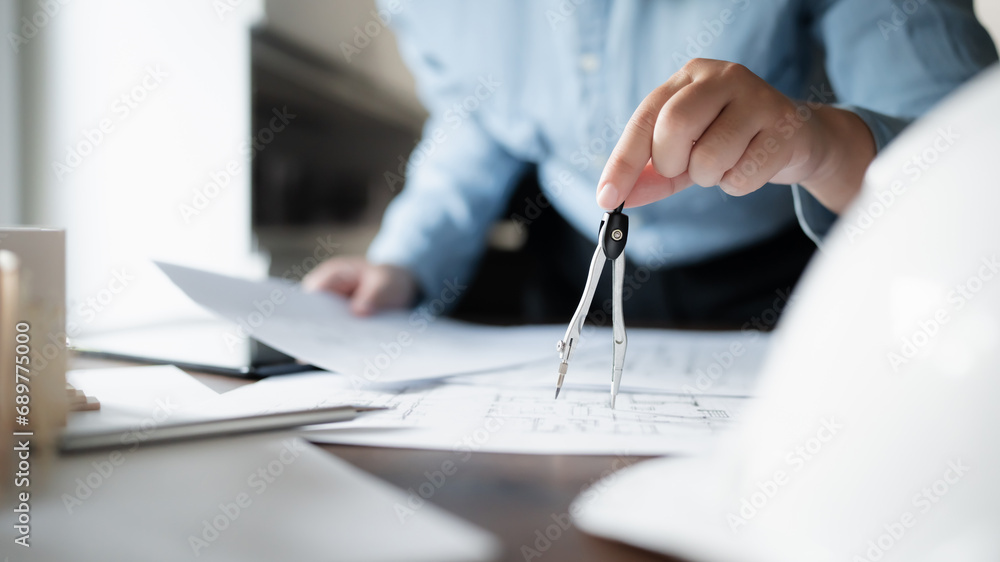 Interior architect working with blueprint planning in modern office, engineering concept. .