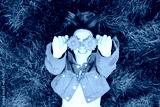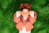 Focus on trendy peach color gerbera Flower glasses in hands of happy smiling redhead woman in jeans jacket lying on green grass. Positive Emotion people. Color of the 2024 year. Spring, summer mood
