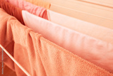 clothes peach fuzz Color year 2024 hanging on dryer, delicate satin with soft pleats, concept Color trend palette. Smooth elegant silk or satin texture. Retro style