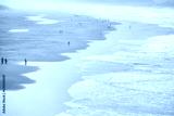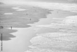 Top view of beautiful landscape in fog, people walking along Ocean Beach, San Francisco. Pacific Ocean.