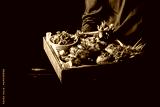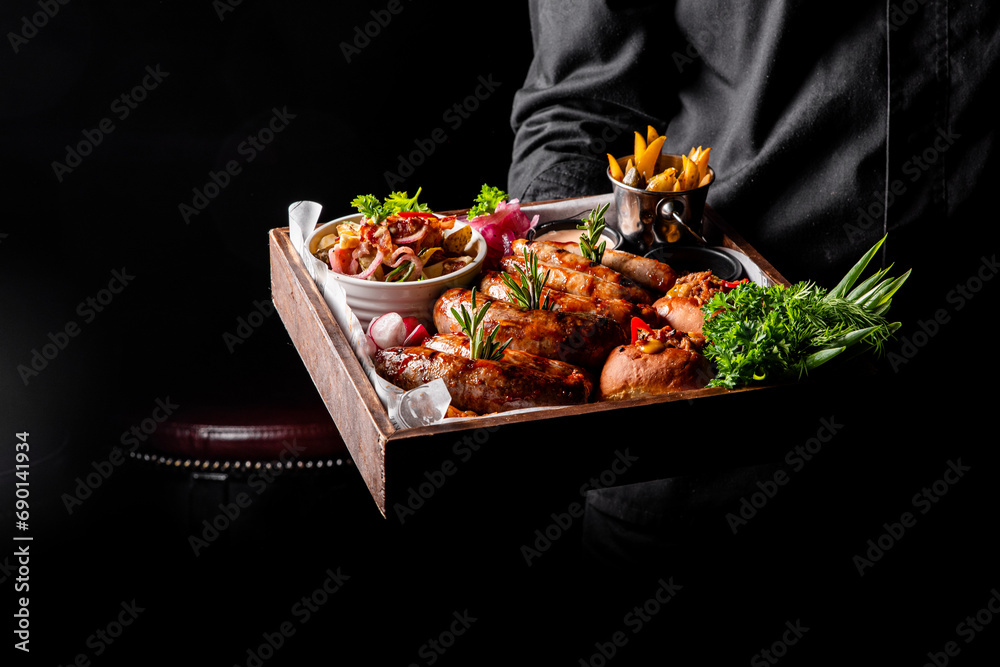 chef or waiter hold Set with various meat Bavarian, Frankfurt, German grilled sausages, Oktoberfest food