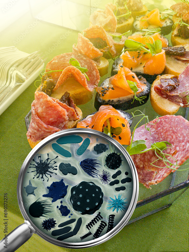 Catering. Magnifying lens with simulated germs, viruses, bacteria, food allergy concept. Set of canapes on buffet table