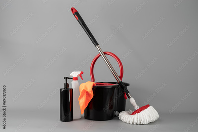 Cleaning concept mop and bucket. Cleaning products and spin mop with red details on the floor in the grey background