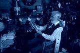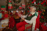 Santa Claus rejoicing with letters and mail in his post office indoors Log Cabin at the North Pole