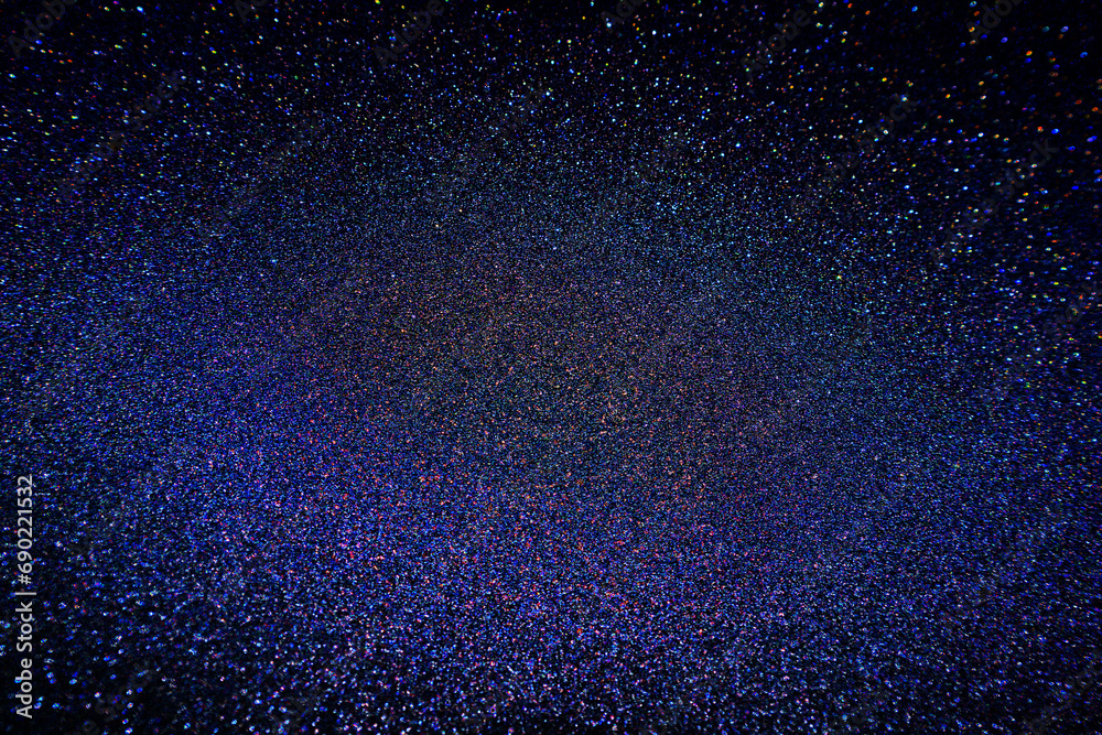 Black dark blue glitter texture abstract banner background with space. Twinkling glow stars effect. Like outer space, night sky, universe. Rusty, rough surface, grain.