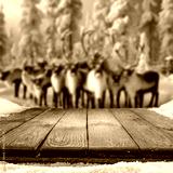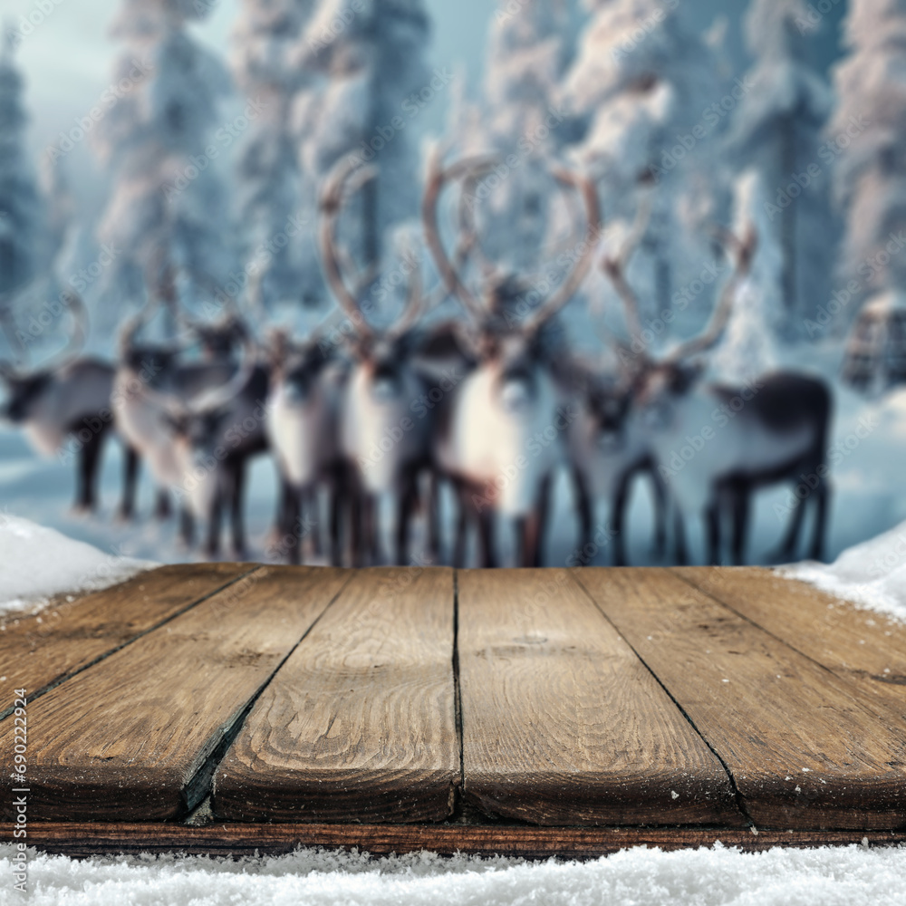 Empty mockup background of cold winter time. Blurred background with reindeers. Landscape of winter forest. Christmas time. Natural light and backdrop.