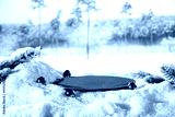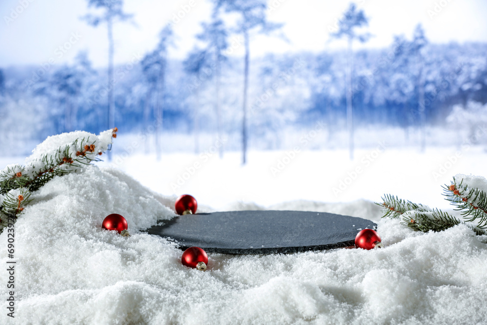 Winter background of snow with frost and empty space for your decoration. Pedestal for your product. Blurred landscape of winter mountains. Christmas time and cold december day. New Year party time.
