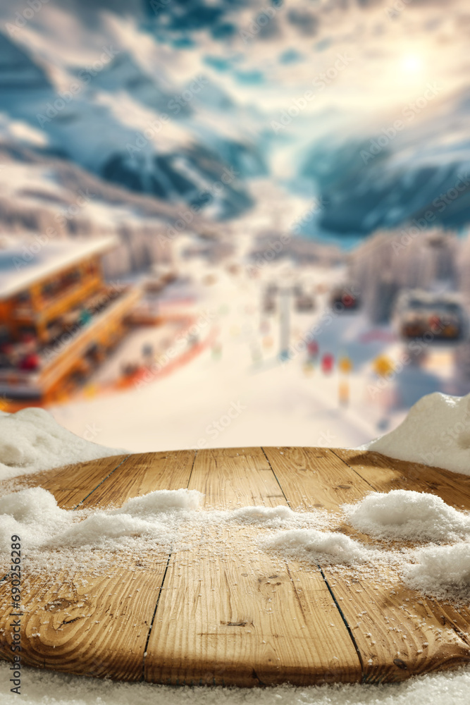 Desk of free space cover of snow and frost with blurred landscape of mountains in Alps.