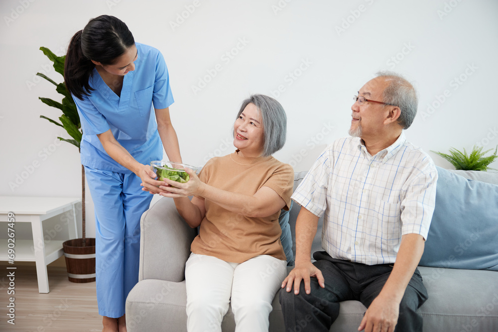 nurse or caregiver serving vegetables in a bowl to senior couple on sofa