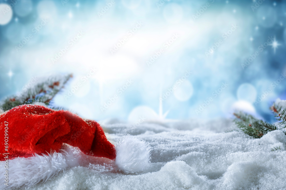 Background of empty space for your decoration. Christmas tree and snow with frost. Mockup backdrop for your products. Cold december time. New year time party.