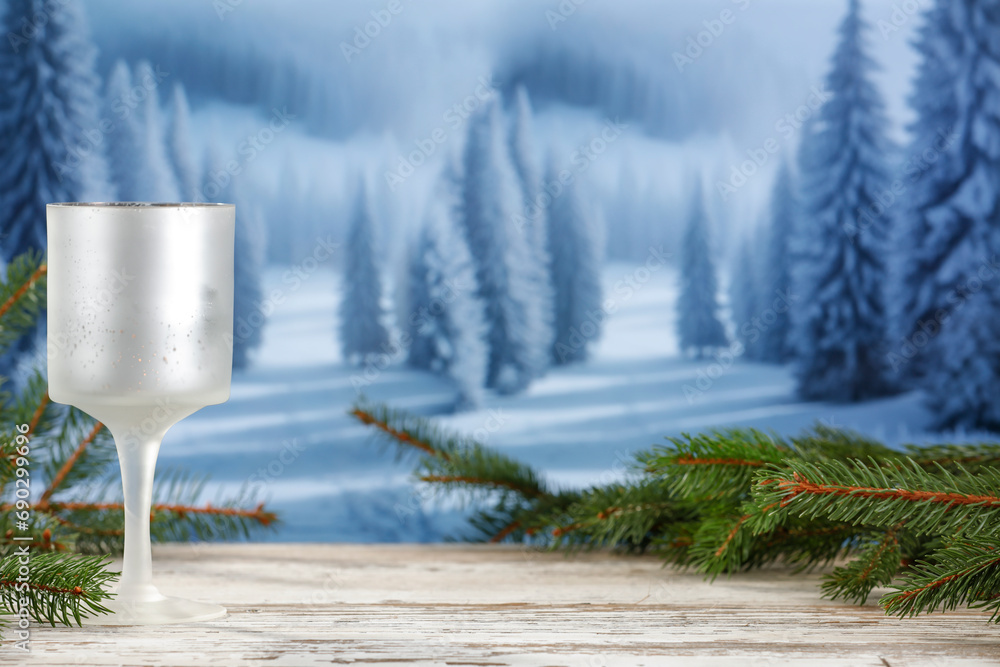 Background of empty space for your decoration. Christmas tree and snow with frost. Mockup backdrop for your products. Cold december time. New year time party.