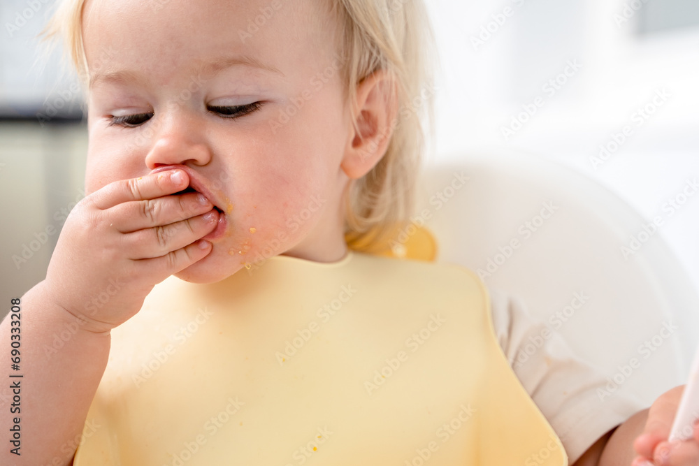 Blonde-haired baby eats mango in a high chair for feeding