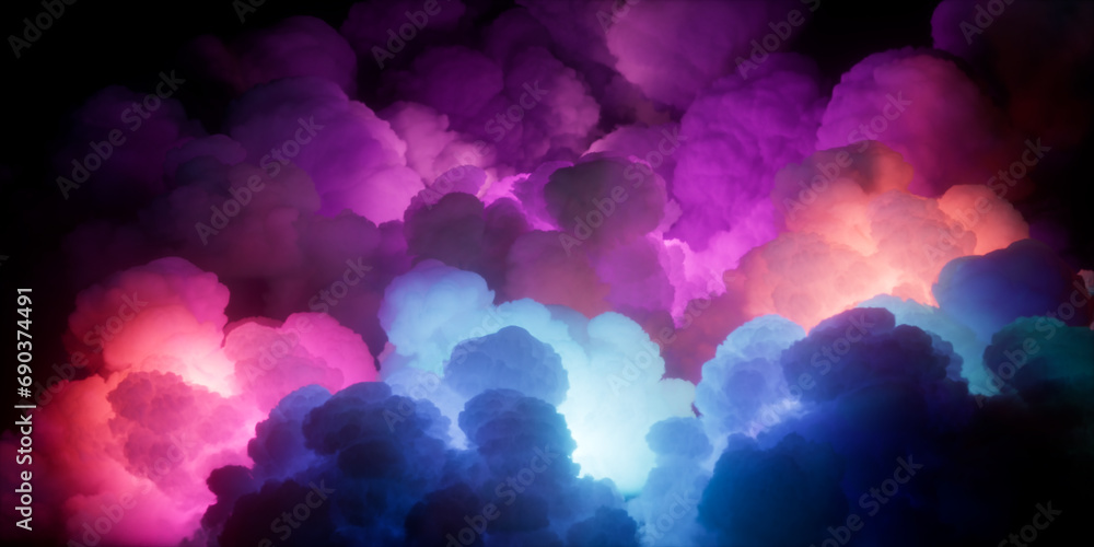 3d render. Abstract background. Panoramic stormy sky. Colorful clouds illuminated with bright neon light. Panoramic wallpaper