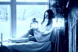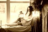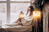 Beautiful young woman holding a white lantern when sitting at windowsill at christmas time. wearing in white sweater and knee socks