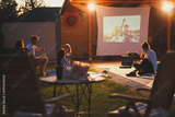 Friends spending summer evening outdoors watching a movie in a backyard open air cinema