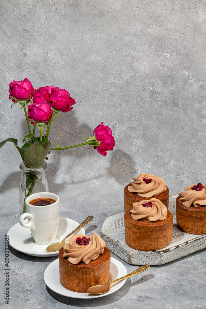 Cakes filled with cream and cherry jam. Box eclairs. New Year and holiday concept.