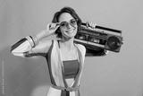 Photo of positive girl having boom box for disco party on christmas new year isolated vivid color background