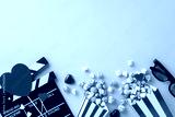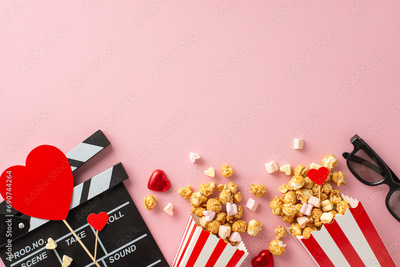 Love-filled movie night. Overhead view of clapperboard, 3D glasses, striped popcorn boxes, heart-themed decorations, candies, marshmallows arranged on charming pastel pink backdrop with space for text