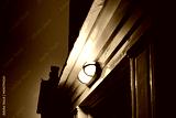Black and white view of a lit bulkhead light seen on a doorway to a private house at dusk. The bulk light is a widely known, industrial design going back 5 decades or more.