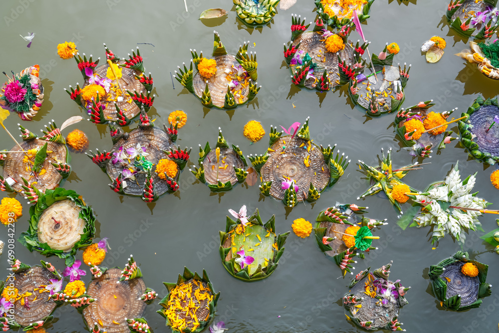Floating gifts to the Gods in the form of flowers and crafts on the river