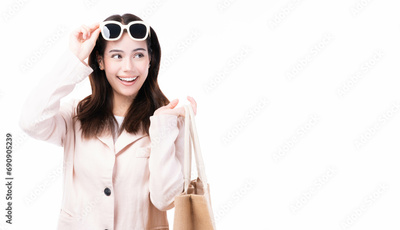 Portrait excited beautiful woman wearing sunglasses hold shopping bags isolated on white background and copy space Surprise happy asian lady open mouth with excited Beauty young female love shopping