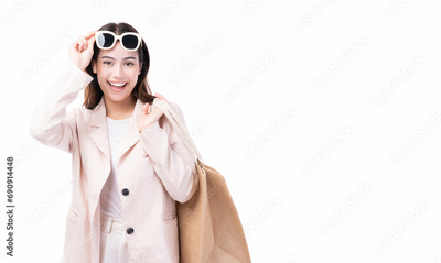 Portrait excited beautiful woman wearing sunglasses hold shopping bags isolated on white background and copy space Surprise happy asian lady open mouth with excited Beauty young female love shopping