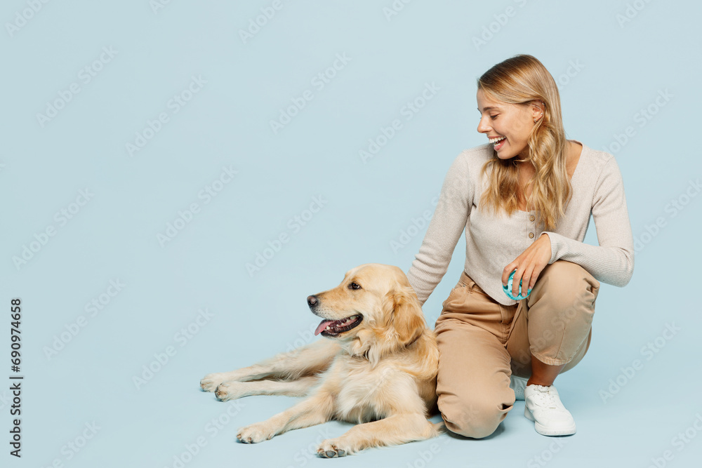 Full body smiling satisfied young owner woman wear casual clothes kneeling hug cuddle embrace her best friend retriever dog isolated on plain light blue background studio. Take care about pet concept.
