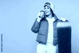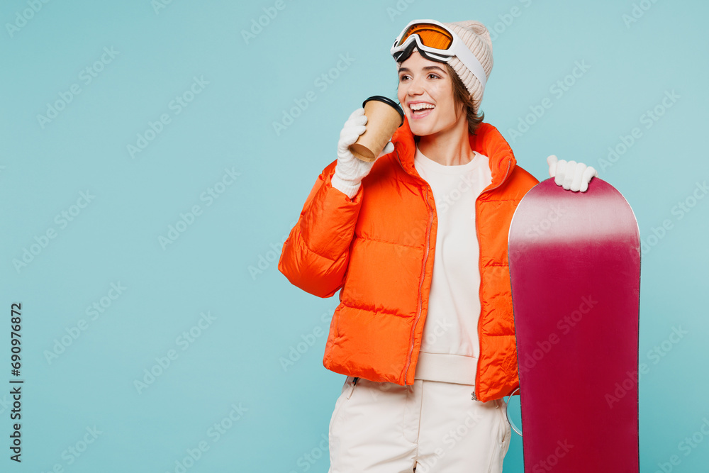 Young woman wear warm padded windbreaker jacket hat ski goggles mask hold snowboard drink hot coffee look aside travel rest spend weekend winter season in mountains isolated on plain blue background.