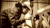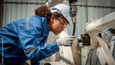 Engineer factory industry wearing safety uniform work and checking system of the welding robots for welding steel electrical by control system robot automate for industry manufacture concept.