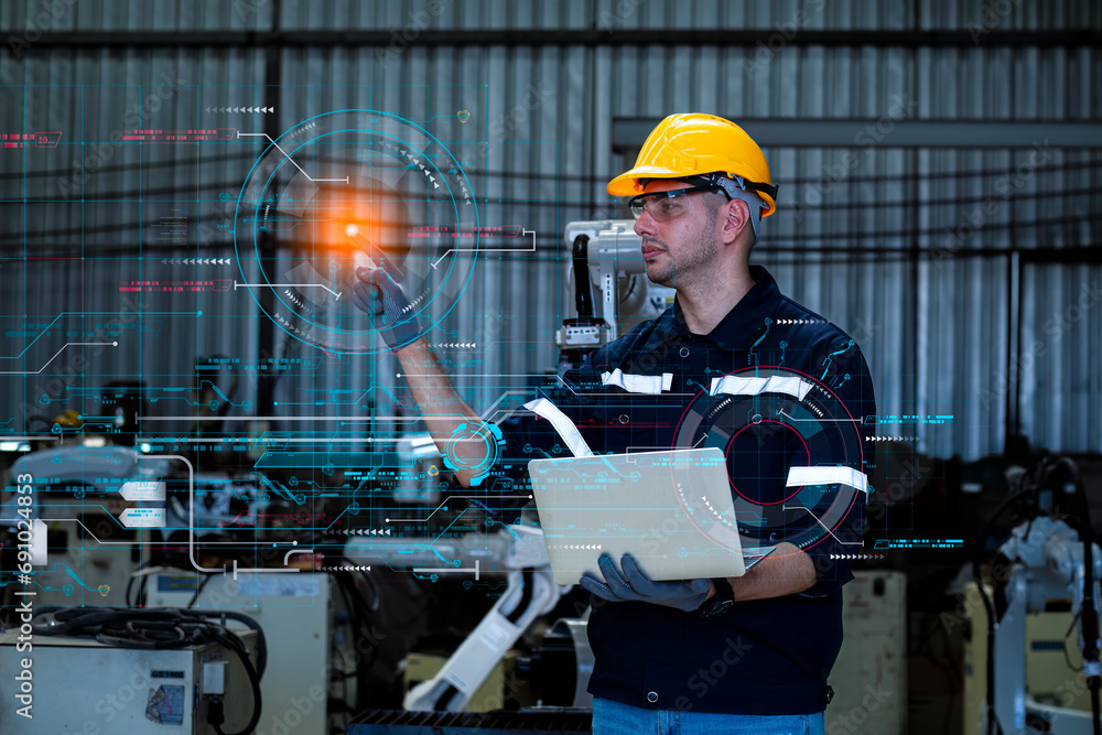 Double exposure engineer worker industry point to hologram info graphic show hi technology industry business of worldwide and hi-technology international industry business concept.