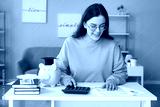 Happy female student sitting at table and calculating her finances. Student loan concept