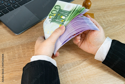 Close-up of female bank employee's hands counting euro bills, paper money, banknotes, Currency Handling Expertise, Money Management Accuracy