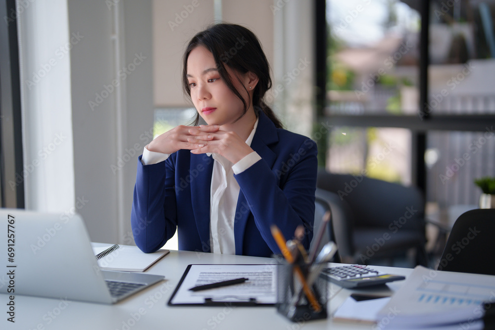 Businesswomen using technology with digital laptop to reading financial data of new business and thinking to analysis strategy investment and management about new startup project in workplace