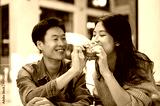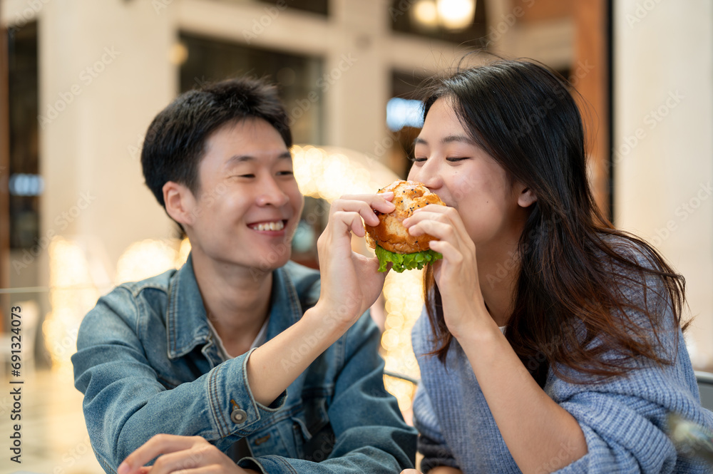 Cheerful young Asian couple enjoys eating a yummy burger on a weekend date at a restaurant.