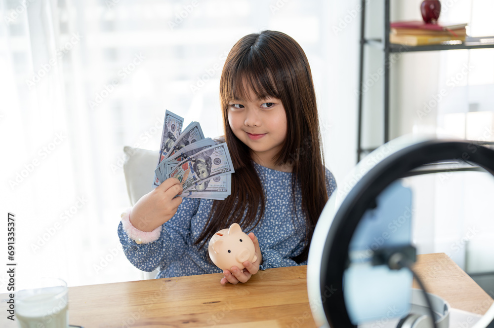 A cute young Asian girl kid influencer is sharing her money saving tips on her social media.