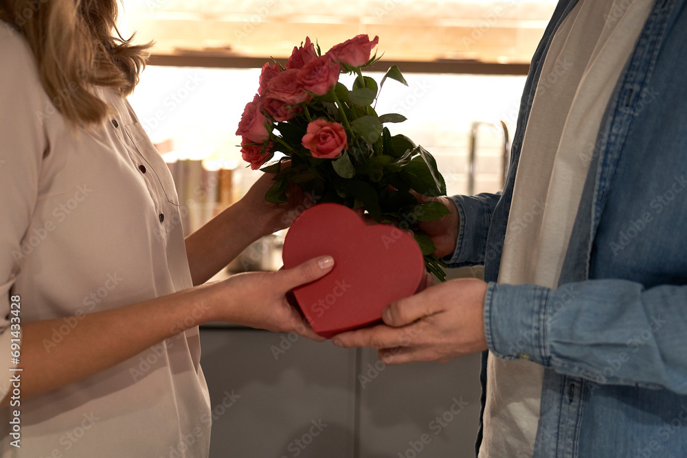 Man giving a box of chocolates and bunch of roses to his beloved woman
