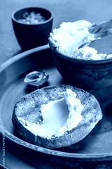 bread with cream cheese on a dark background. vertical image. top view. copy space for text