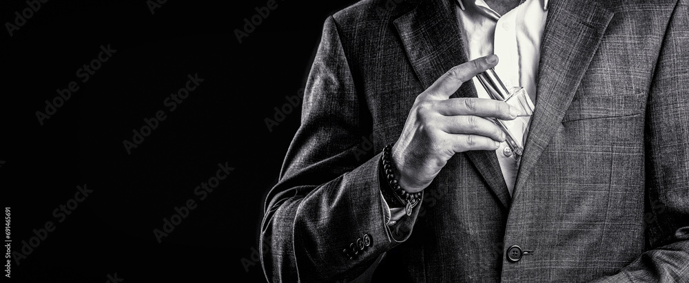 Fragrance smell. Men perfumes. Fashion cologne bottle. Man holding up bottle of perfume. Men perfume in the hand. Man in formal suit, bottle of perfume, closeup. Black and white