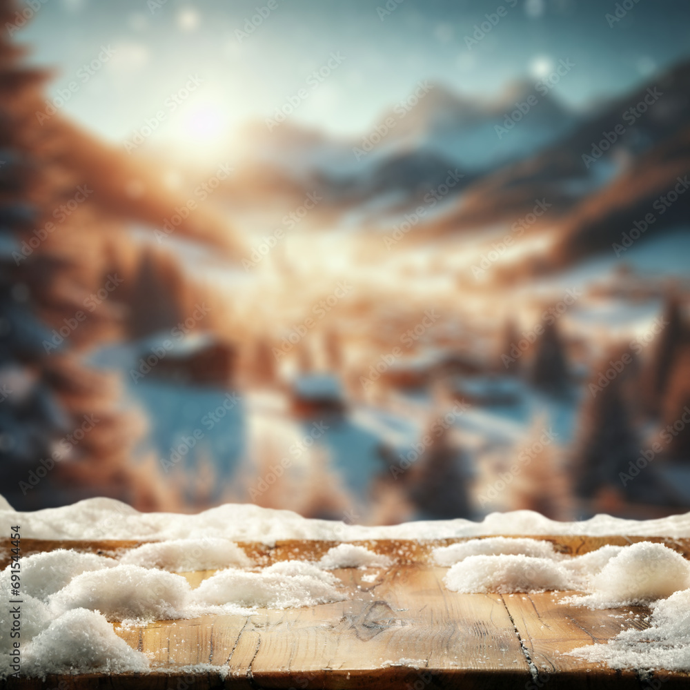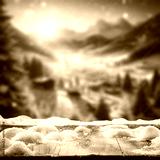 Wooden desk of free space for your decoration and winter landscape. Christmas time in mountains. Cold december time and mockup background for your products. New year time .