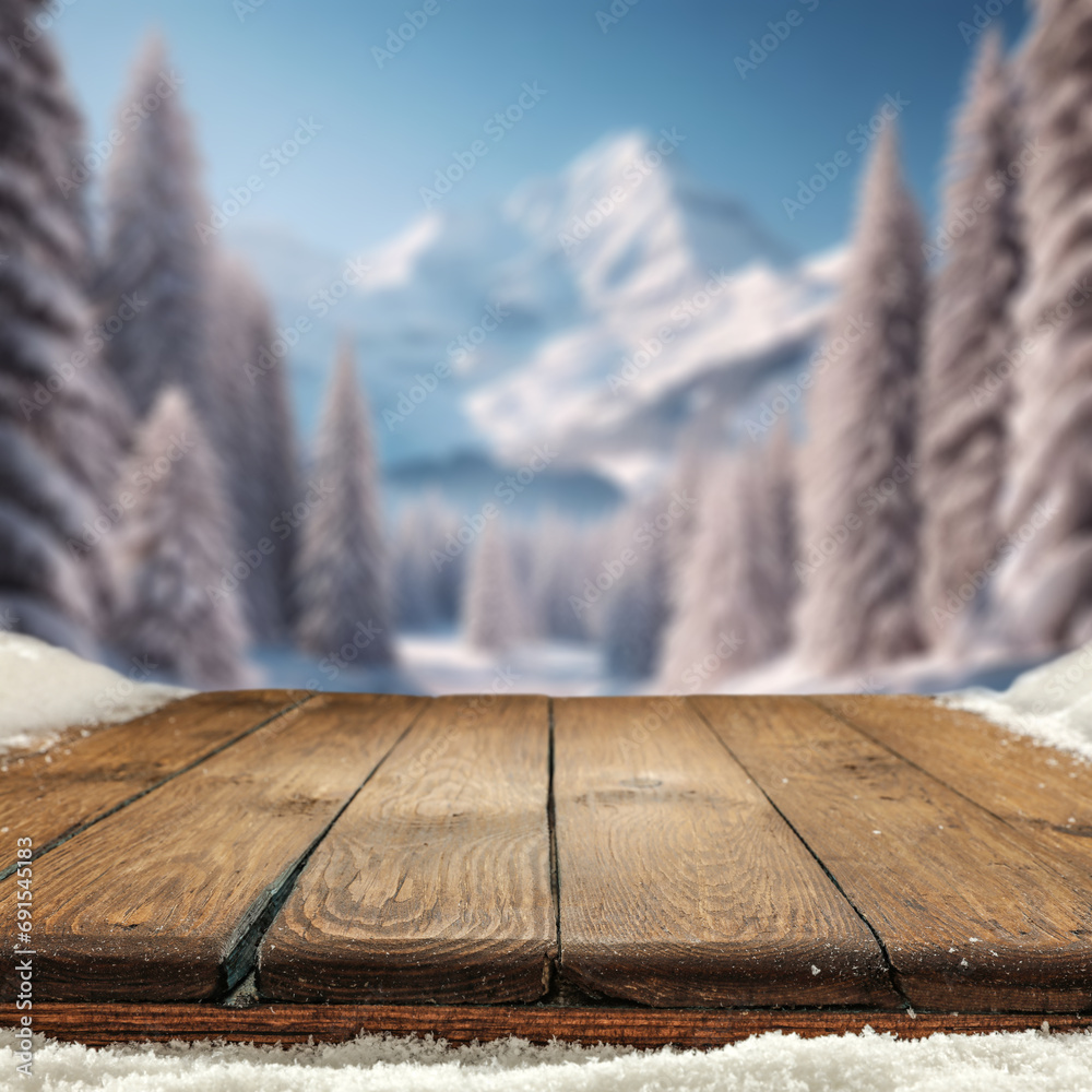 Wooden desk of free space for your decoration and winter landscape. Christmas time in mountains. Cold december time and mockup background for your products. New year time .