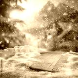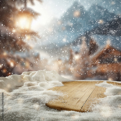 Wooden desk of free space for your decoration and winter landscape. Christmas time in mountains. Cold december time and mockup background for your products. New year time .