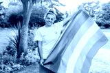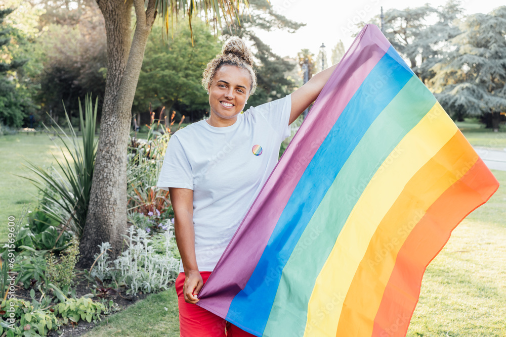 Mixed race woman with a rainbow flag outdoor. Young lesbian activist smiling and holding flag symbol of social movement Lgbtq. Fight for equality, freedom and human rights. Celebrating Pride month.