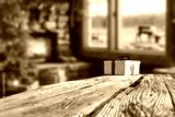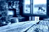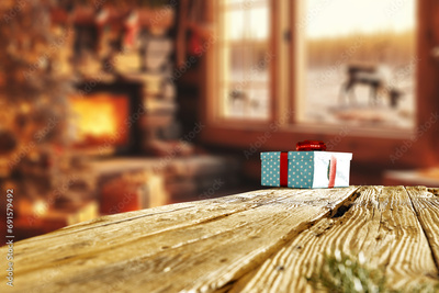 Wooden desk of free space for your decoration and christmas gift. Home interior with fireplace and warm natural light. Mockup backdrop and cold december time.