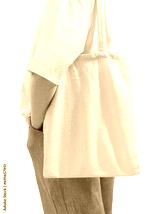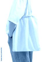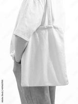 Carrying modern trendy eco tote bag on shoulder. Woman with shopper isolated on white background