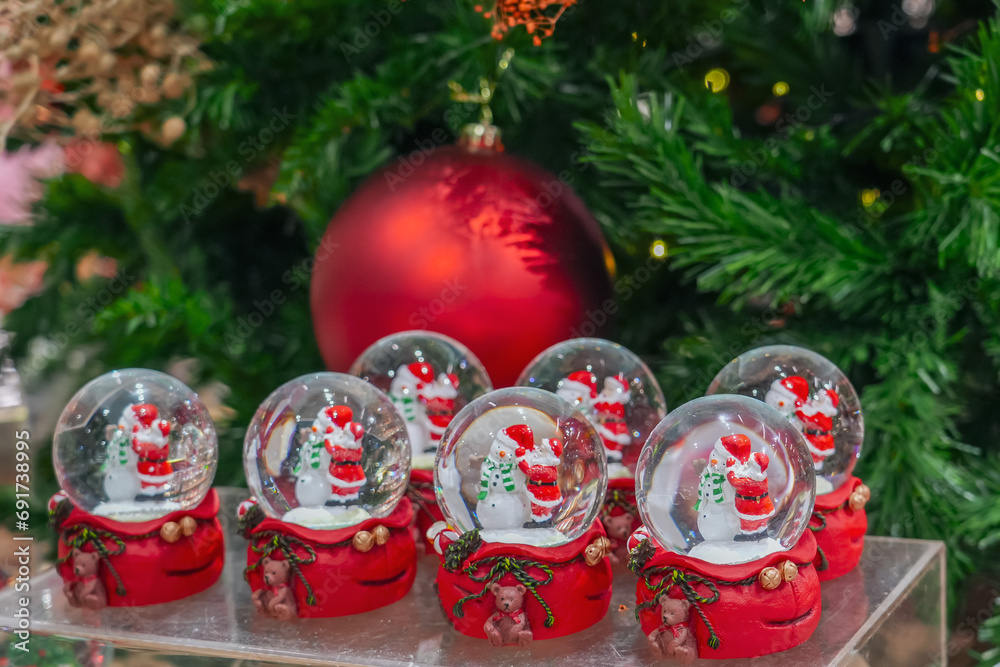 Lots of glass balls with Santa Claus and Christmas candy inside snow, fair, market under the green tree