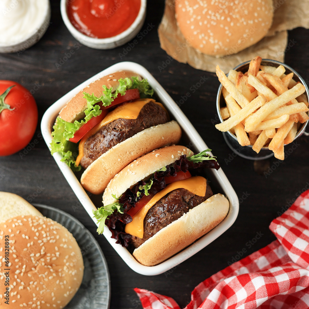 Homemade Cheese Beef Burger Packed on White Lunchbox.