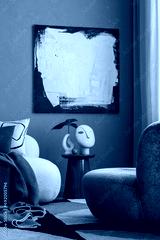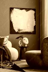 Warm and cozy living room interior with mock up poster frame, patterned rug, green armchair, round coffee table, decoration. Template.