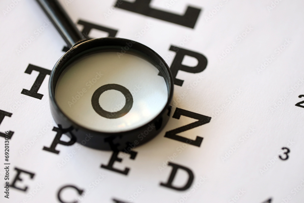 Magnifier glass focuses eye chart letters clearly and lies on eye test chart paper close up