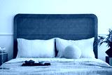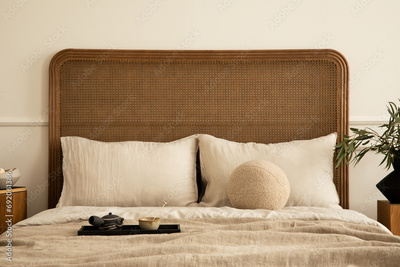 Creative composition of bedroom interior with cozy bed, beige bedding, plaid, trace with pitcher and cup, wooden night table, round pillow and personal accessories. Home decor. Template.